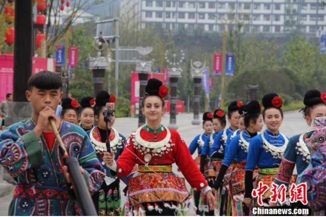 穿著苗族服飾的中美與苗族姑娘們一起游街 文興貴 攝