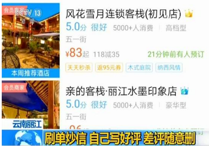 日前發布的新《反不正當競爭法》,對電子商務領域虛假宣傳行為做了明確規定,經營者采用刷單、炒信、刪除差評等方式,幫助自己或其他經營者進行虛假宣傳或引人誤解的商業宣傳,將受到嚴厲處罰。而記者日前發現,在云南麗江,就有不少客棧實行網絡刷單,自我提升滿意度評價,利用網絡虛假宣傳誤導消費者。【上海鄰米網站,商城開發,單商城多商城建站仿站,專業省心,一站到家,優惠多多】