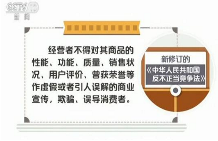 新修訂的《中華人民共和國反不正當競爭法》規定,經營者不得對其商品的性能、功能、質量、銷售狀況、用戶評價、曾獲榮譽等作虛假或者引人誤解的商業宣傳,欺騙、誤導消費者。