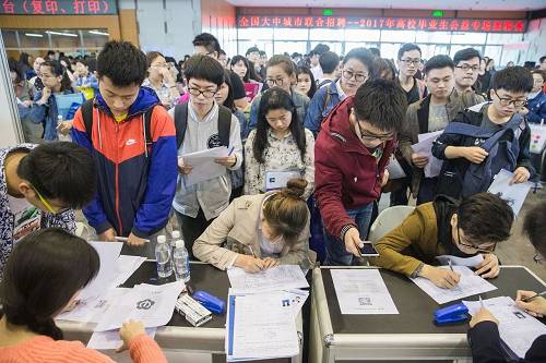每逢求職季,中國的畢業生們大概習慣了在招聘攤位排起長龍遞簡歷。