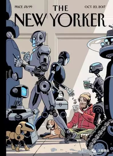 封面上,人類坐地行乞,機器人則扮演了施予者的角色,意指明顯——在未來社會,人類的工作機會被不斷進化的機器人剝奪,從而淪為了流落街頭的弱者。